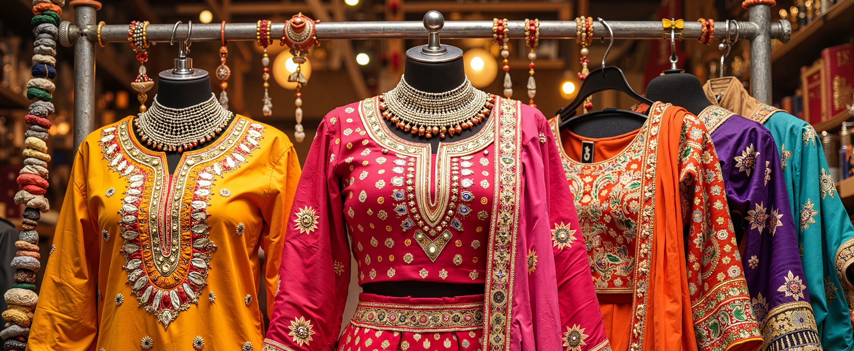 - Sarees, lehengas, anarkalis, shararas, kurtas, and dupattas